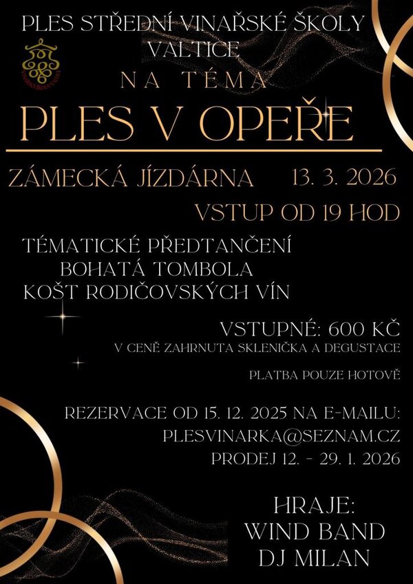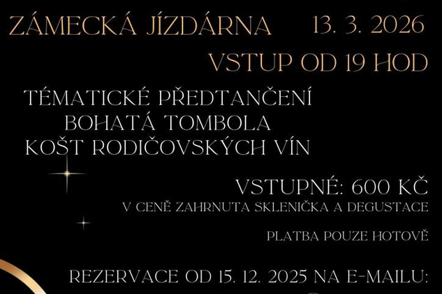 Střední vinařská škola Valtice pořádá v pátek 13. března 2026 ples v Zimní jízdárně zámku Valtice, začátek v 19.00.