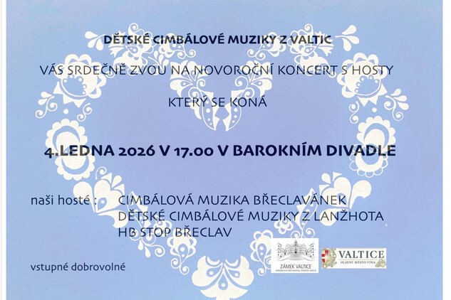 Novoroční koncert dětských cimbálových muzik z Valtic a jejich hostů se uskuteční v neděli 4. ledna v 17:00 v divadle zámku Valtice. Srdečně zvou pořadatelé, vstupné dobrovolné.