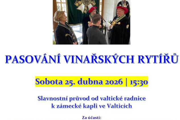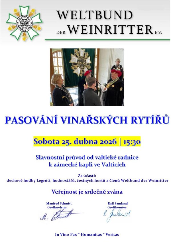 Organizace Weltbund der Weinritter (Světový spolek vinařských rytířů) si pro svůj jarní konvent v roce 2026 vybrala Valtice, hlavním bodem programu bude slavnostní pasování nových vinařských rytířů, které proběhne