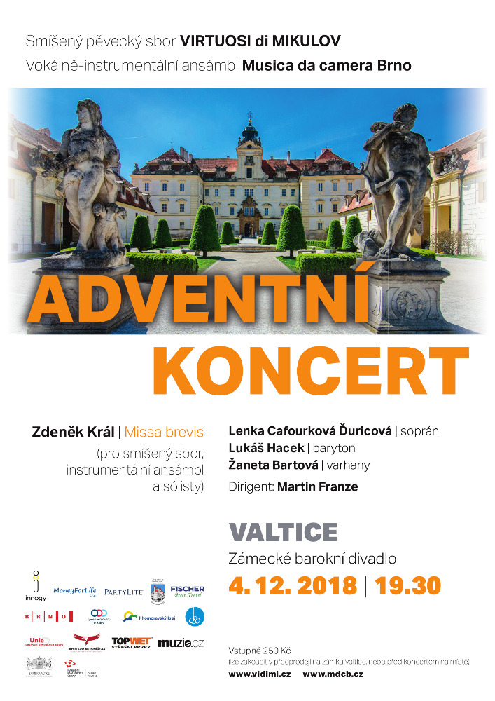 V úterý 4. prosince se v zámeckém divadle od 19:30 uskuteční adventní koncert pěveckých sborů Virtuosi di Mikulov a Musica da camera Brno, jako hlavní program bude uvedena Missa brevis od Zdeňka Krále.