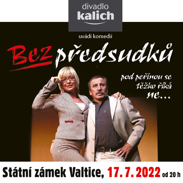 Na zámek ve Valticících Vám přinášíme oblíbenou stálici z repertoáru Divadla Kalich "Bez předsudků". Výtečná komedie s Janou Paulovou a Pavlem Zedníčkem o kamarádství, o tajemstvích, o zvědavosti a hlavně - o nás všech.