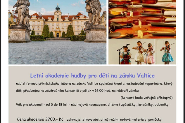Zkušená lektorka hudby Veronika Svačinová, ve spolupráci se zámkem Valtice, uspořádá druhý červencový týden v Bílém sále na zámku Valtice příměstský tábor pro mladé milovníky hudby. Výstupem týdenní Letní akademie hudby pro děti bude veřejný koncert všech účastníků na nádvoří zámku v pátek 14. července v 16:00, na kterém děti předvedou, co se naučily.
