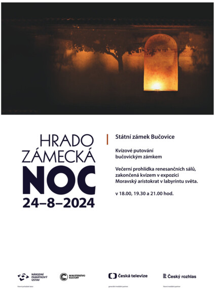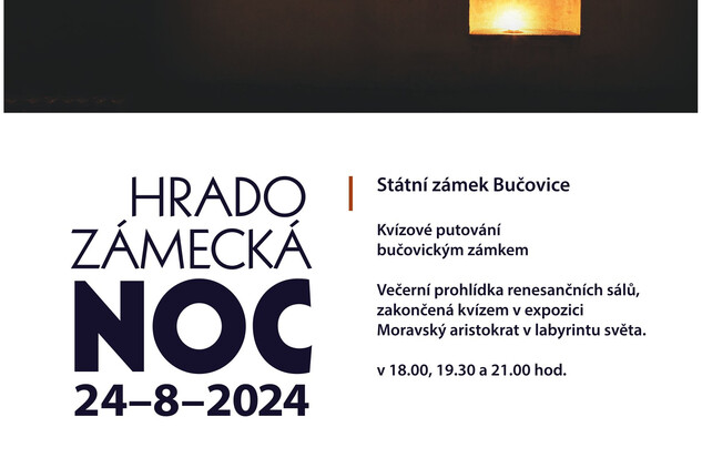 Hradozámeckou noc si můžete 24. srpna 2024 užít i na zámku v Bučovicích. Čeká vás večerní prohlídka renesančních sálů zakončená kvízem v expozici Moravský aristokrat v labyrintu světa. Časy jednotlivých prohlídek jsou: 18.00, 19.30, 21.00 hodin.