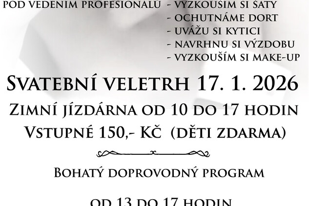 V sobotu 17. ledna od 10:00 do 17:00 se v zámecké Zimní jízdárně uskuteční Svatební veletrh, který nabídne bohatý program nejen pro ty, kteří plánují svatbu v roce 2026, ale pro všechny příznivce společenských šatů, líčení či slavnostních květinových výzdob.