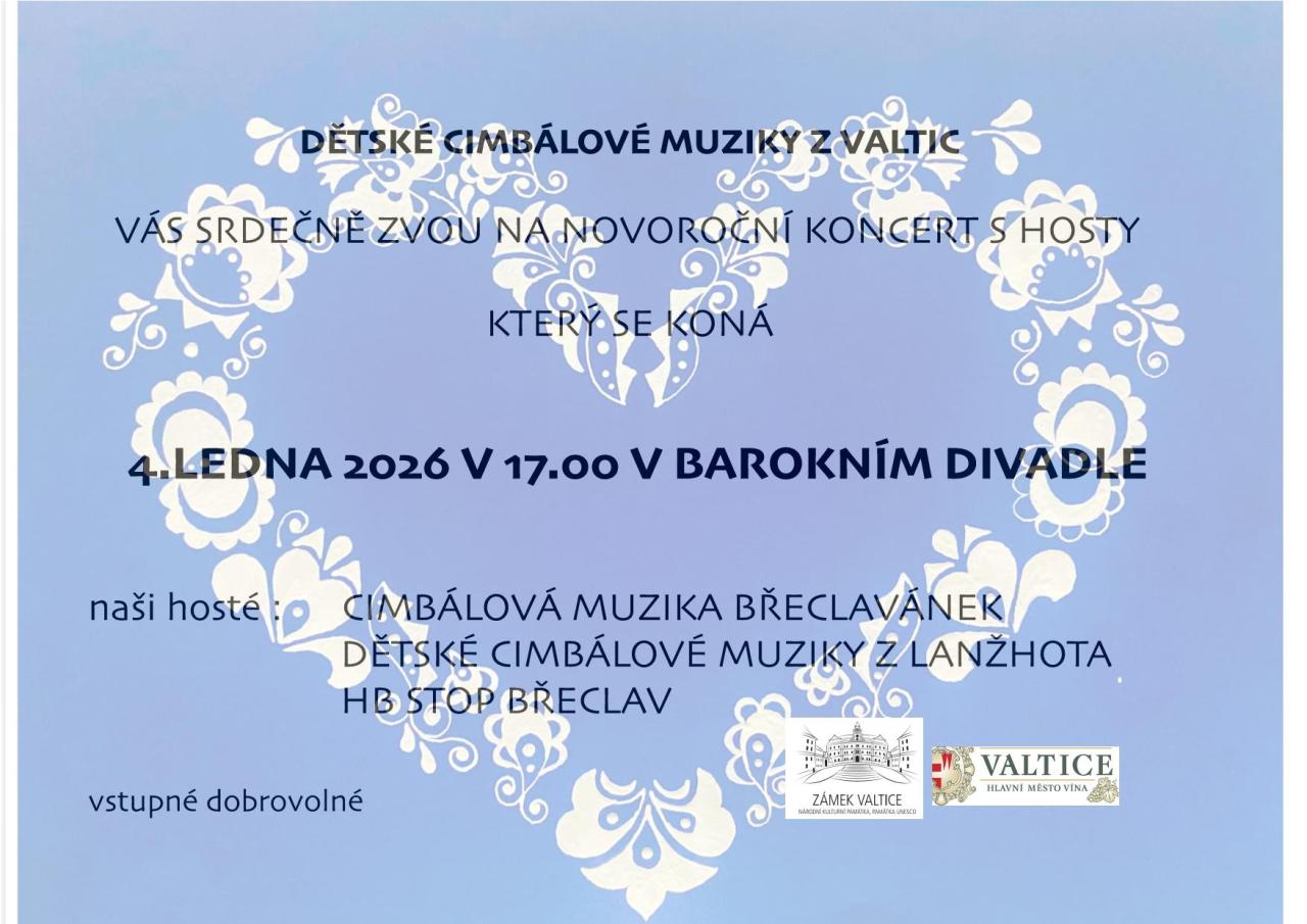 Novoroční koncert dětských cimbálových muzik z Valtic a jejich hostů se uskuteční v neděli 4. ledna v 17:00 v divadle zámku Valtice. Srdečně zvou pořadatelé, vstupné dobrovolné.