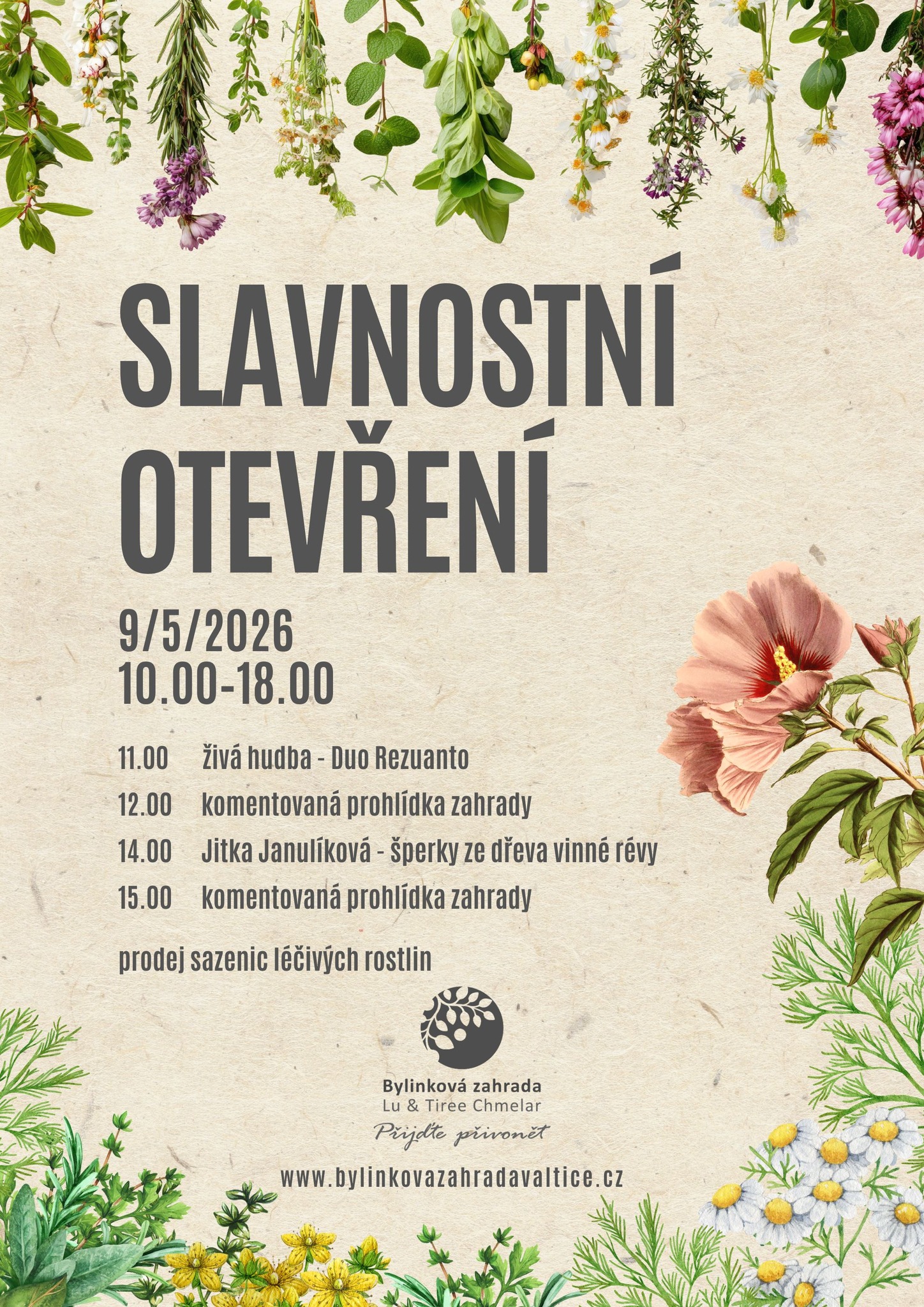 Srdečně vás zveme na slavnostní zahájení sezóny 2026 v Bylinkové zahradě Lu & Tiree Chmelar ve Valticích. Přijďte se potěšit z atmosféry bylinkové zahrady, relaxovat na lehátku ve stínu stromů nebo nakoupit sazenice léčivých rostlin a lokální produkty v našem obchůdku.