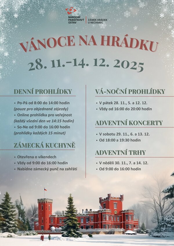 Dovolujeme si Vás pozvat na 31. ročník akce Vánoce na Hrádku u Nechanic. Od 28. listopadu do 14. prosince 2025 Vás ve vánočně vyzdobených interiérech seznámíme s historií Vánoc, jejich zvyky a tradicemi.